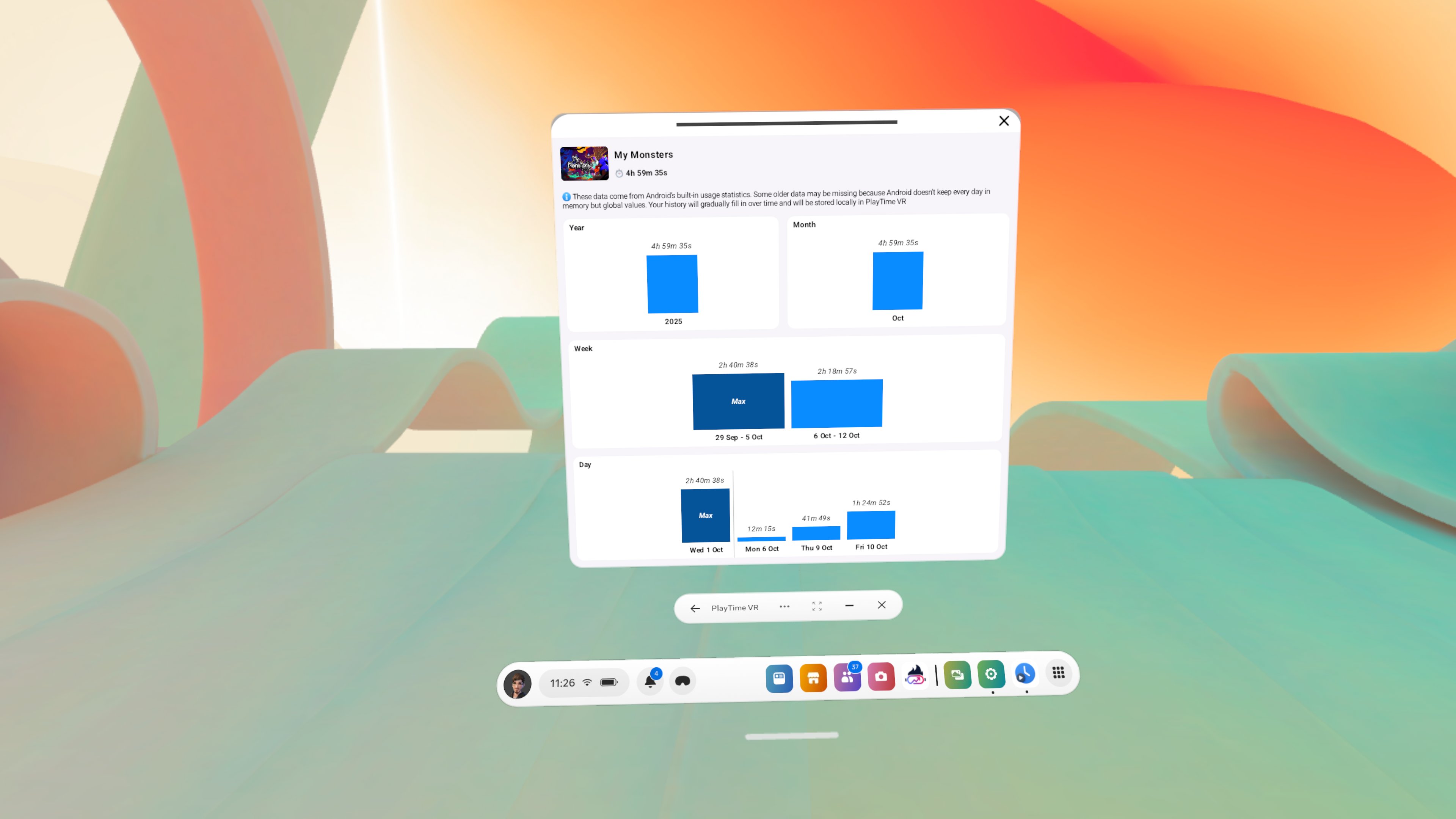 Usage data comes from the headset’s Android system, which groups it by year, month, week, and day. Android keeps only a limited number of records for each interval to prevent overload. Some older data may therefore be missing, and the same applies if you have uninstalled applications or reset your headset.